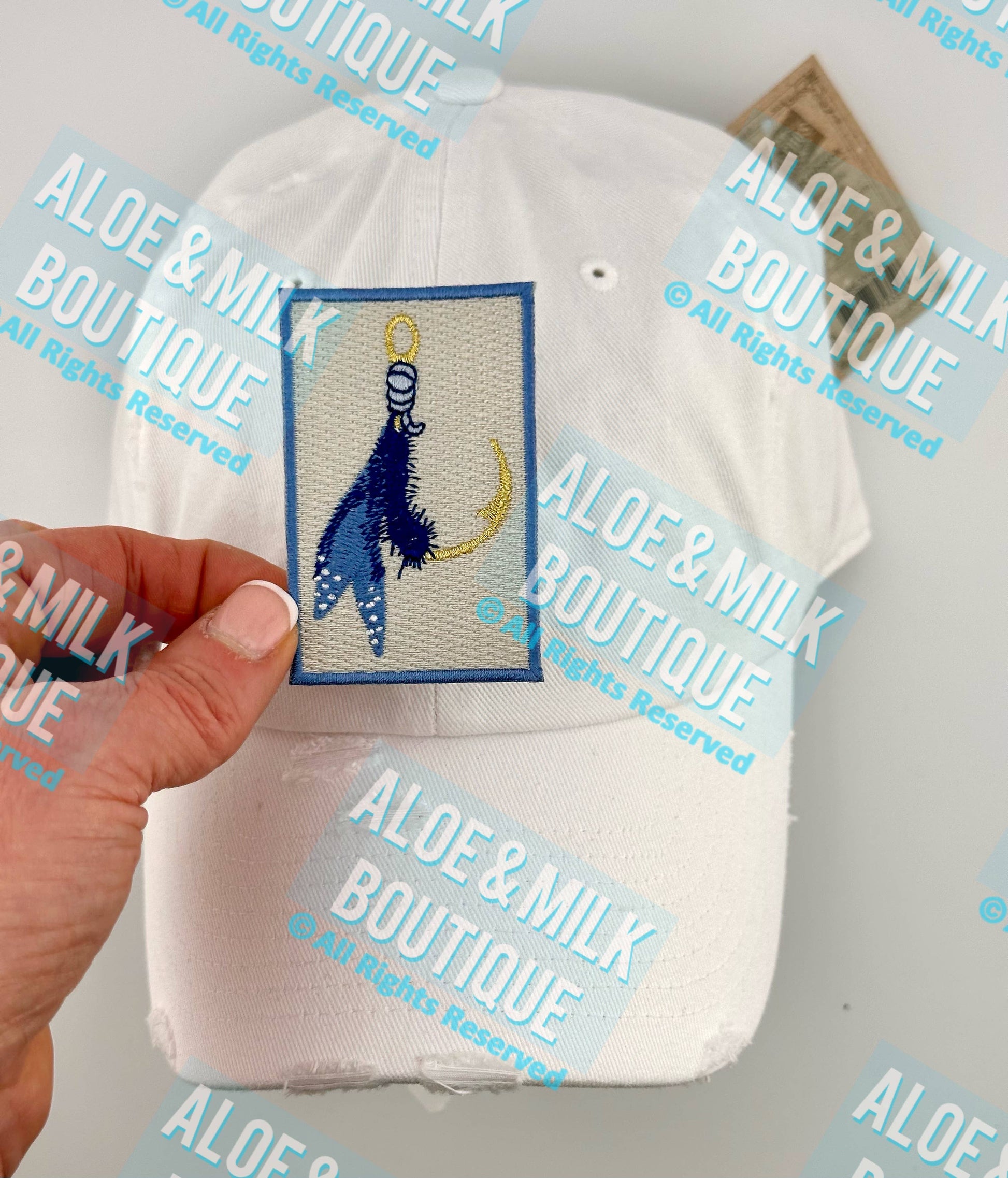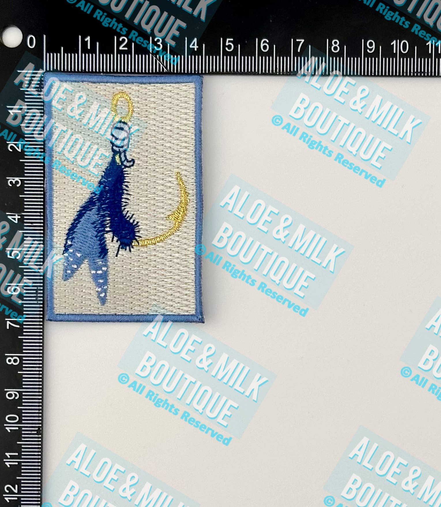 this fly fishing hook has blue color accents and is 100% embroidered. Iron on backing and heat cut border. Measures 4.6cm x 7cm. Great for hats, bags, clothing and more!